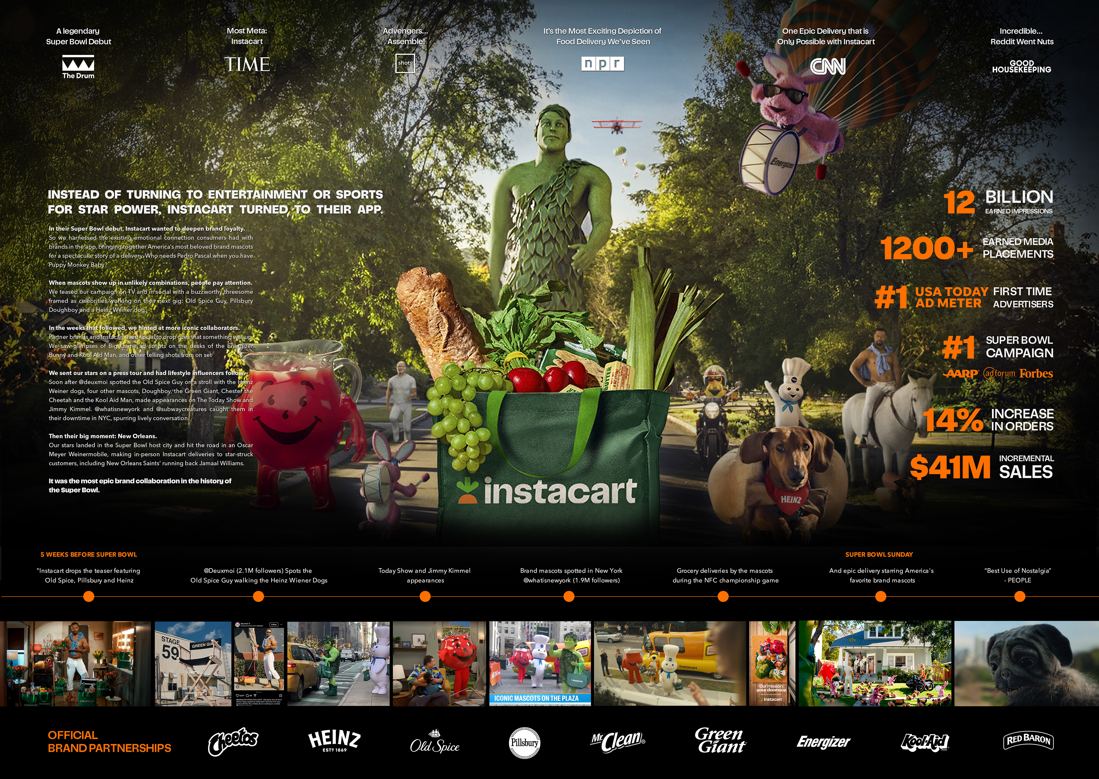 While other Super Bowl advertisers looked to celebrities, we looked to Instacart's app to land an idea for Instacart's first Super Bowl campaign, gathering iconic brand mascots to tell the spectacular story of an everyday grocery delivery. Chester Cheetah, Puppy Monkey Baby, Pillsbury Doughboy, Old Spice Guy and more marched into millions of living rooms to bring together America's favorite brands to show Instacart is always for them.