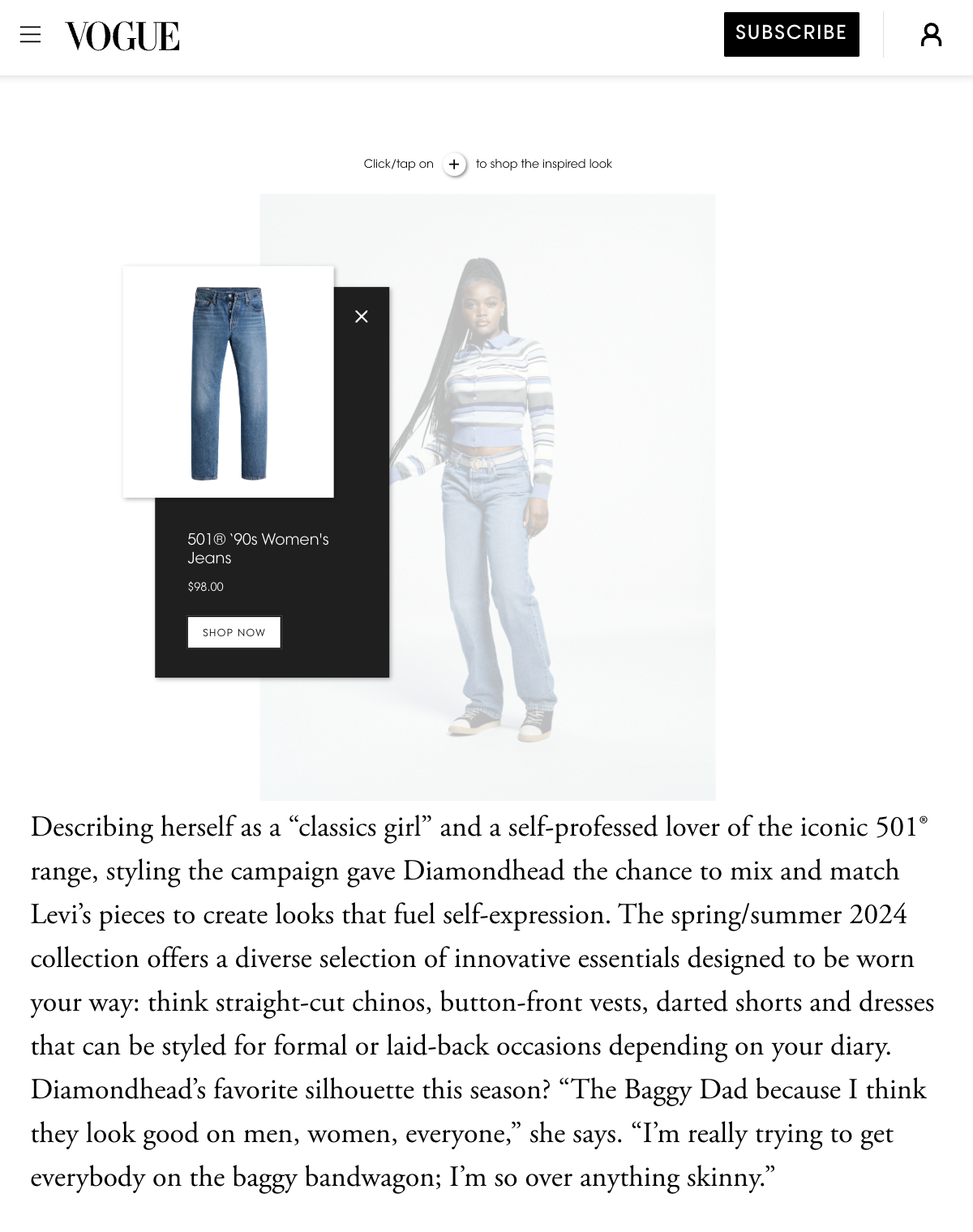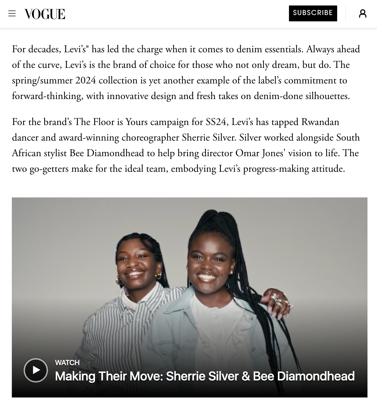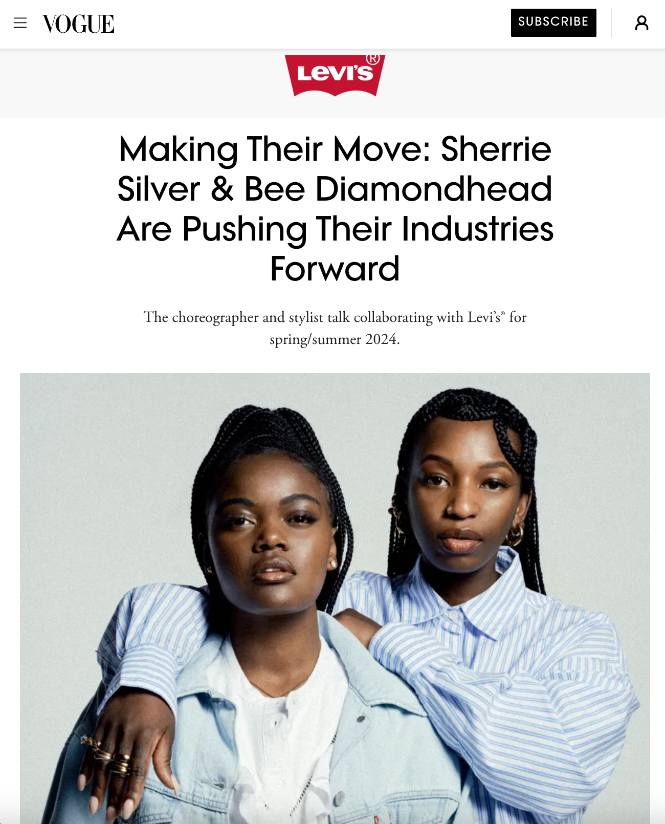 To further inspire people, we partnered with Vogue to spotlight two of our collaborators, choreographer Sherri Silver and stylist Bee Diamondhead, who are driving progress in their industries. In the editorial, the women talk about working together, progressing through their industries as Black African women and the Levi’s pieces they love most.