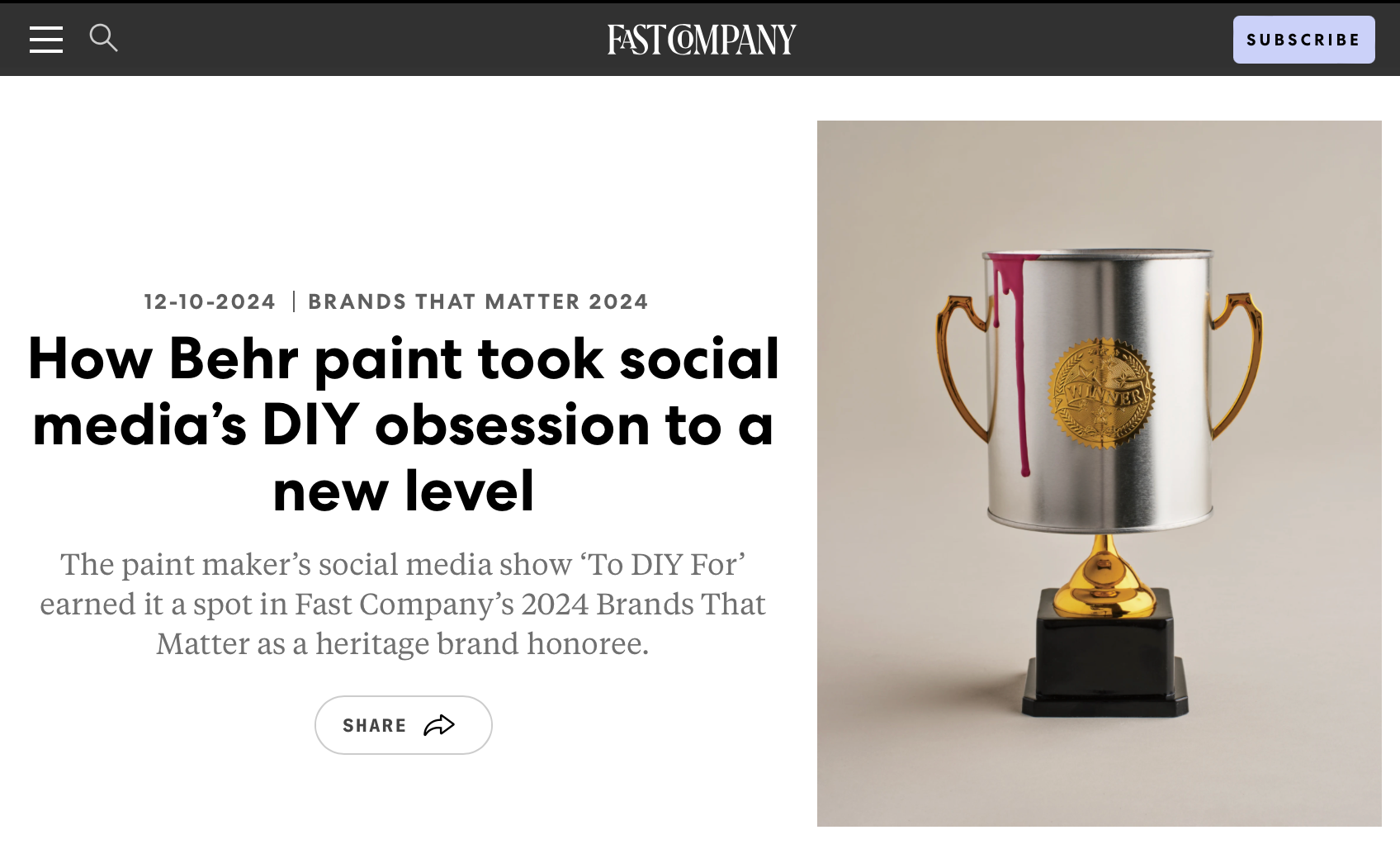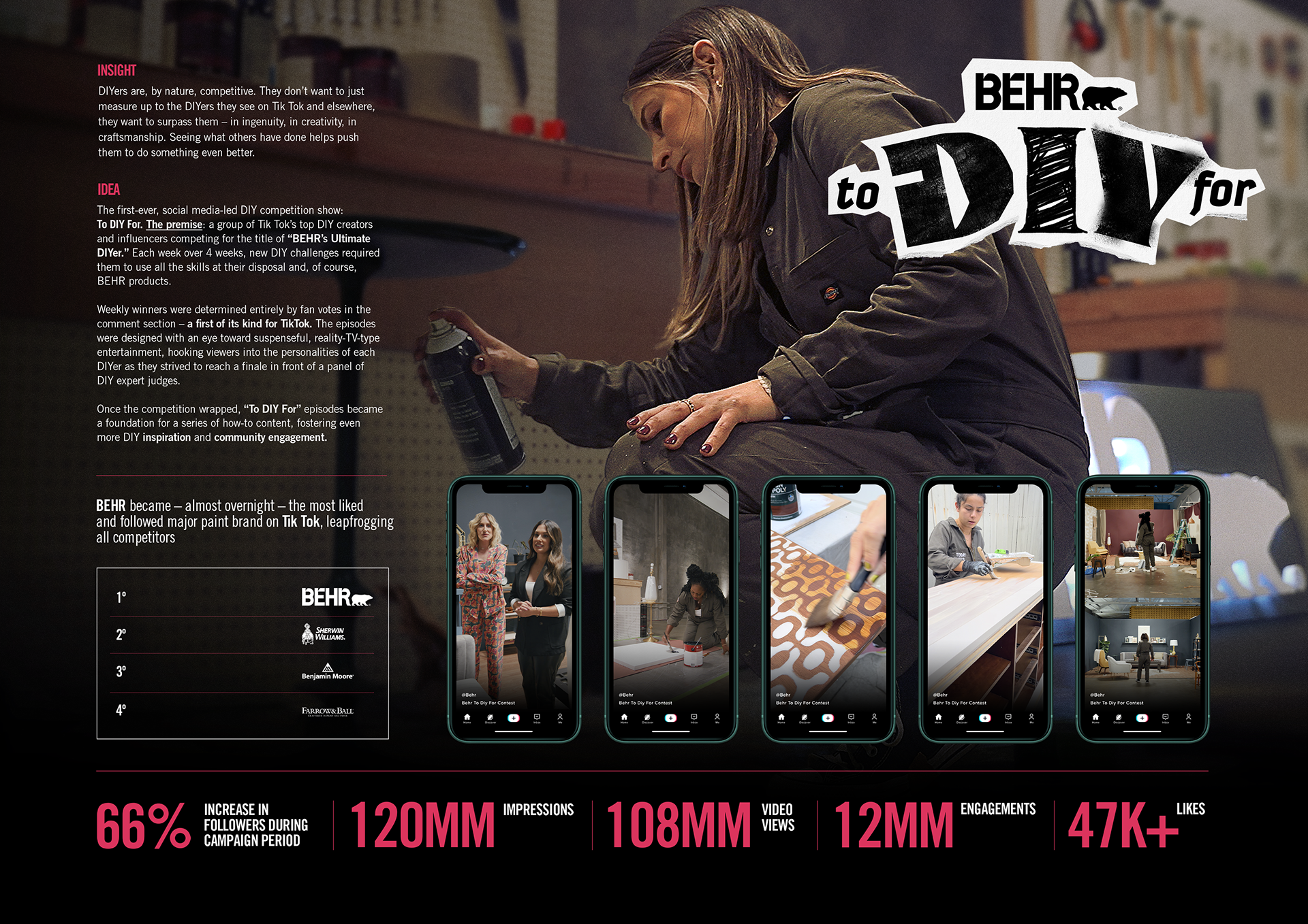 Each "Do or DIY" episode was posted to @Behr's channels, where fans were be able to help decide who stays and who plays. The rounds of competition varied in medium, theme, style, and function. Our host revealed the DIY goal in each round, and contestants were judged by fan vote on social and a judging panel based on Behr’s DIY coach criteria.
